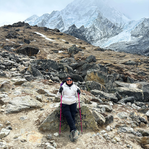 We set off from Lobuche, trekking through rock-strewn glacial valleys, where each step felt heavier due to the altitude and exhaustion. The landscape was stark and dramatic - gray, barren, and carved by the forces of nature, with towering ice formations in the distance. As we progressed, we could see the impact of climate and altitude on the terrain, with loose stones, shifting paths, and the Khumbu Glacier’s icy ridges framing our route.